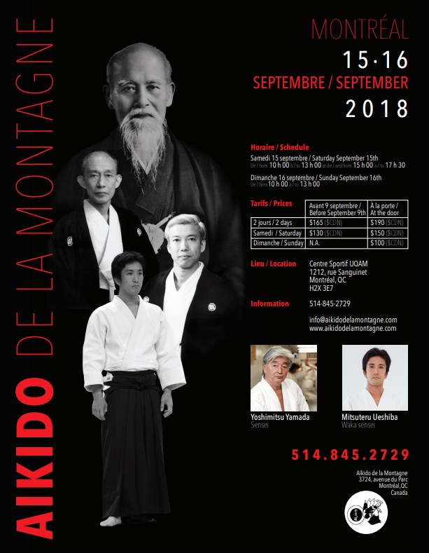 Save the date – Please find see below for the link to a seminar to be held in Montreal, with Waka sensei, Honbu dojo Tokyo, and Yoshimitsu Yamada-Shihan, 8th Dan from New York Aikiai, being organized by Aikido De La Montagne, and to be held from September 15 to 16, 2018.